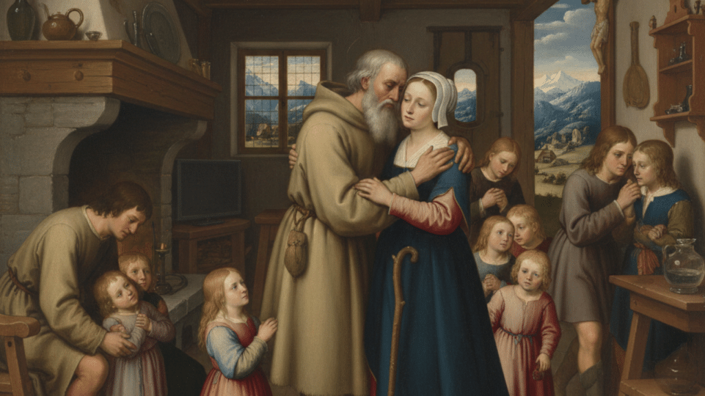 - El Difícil Desprendimiento: En 1467, con el consentimiento de su esposa, Dorotea (quien mostró una fortaleza y santidad admirables al aceptar el sacrificio), Nicolás abandonó su hogar. Antes de partir, se despidió de su familia, un acto que simbolizaba su total renuncia al mundo.