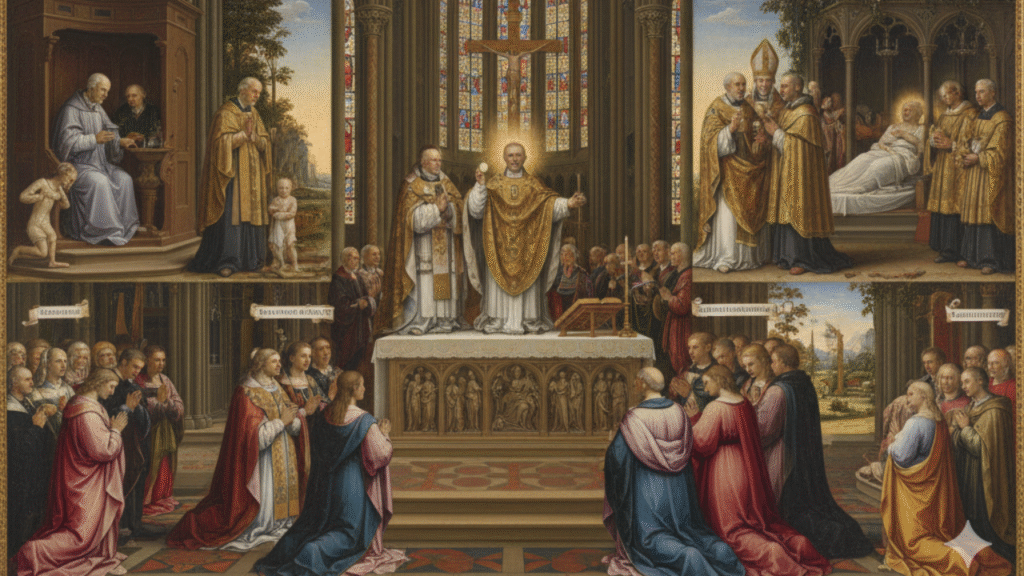 - Catolicismo: Reconoce siete sacramentos (Bautismo, Confirmación, Eucaristía, Penitencia, Unción de los Enfermos, Orden Sacerdotal y Matrimonio) como signos visibles instituidos por Cristo que confieren la gracia. La Eucaristía es central, con la creencia en la presencia real de Cristo (transubstanciación).