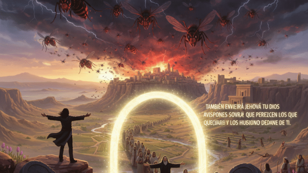 - Deuteronomio 7:20: Promete una ayuda sobrenatural para la conquista: "También enviará Jehová tu Dios avispones sobre ellos, hasta que perezcan los que quedaren y los que se hubieren escondido delante de ti."