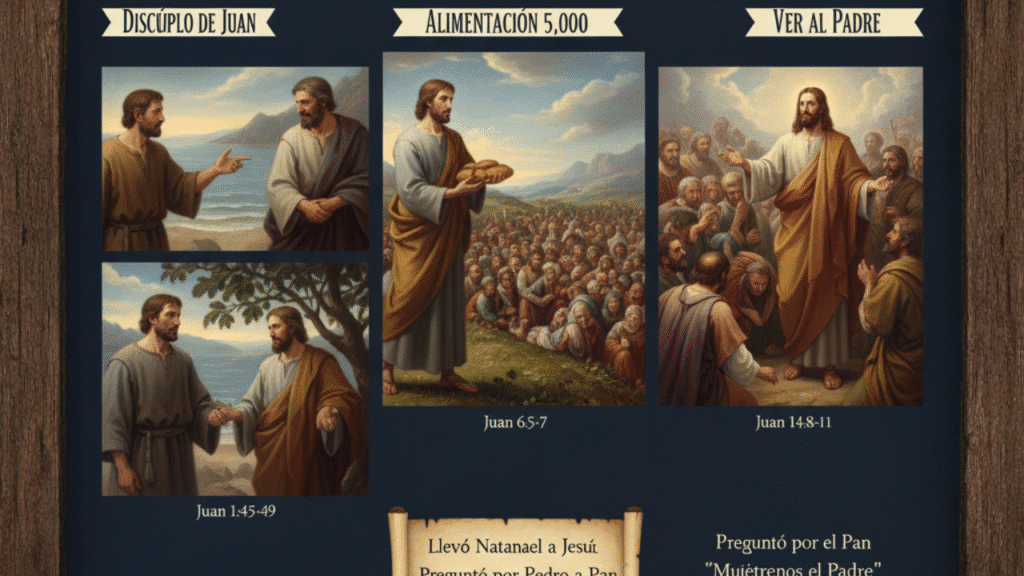5. Felipe: No debe confundirse con Felipe el Evangelista (Hechos 8). Fue Felipe, discípulo de Jesús, quien le dijo a Jesús antes de la alimentación de los 5,000: "¿Dónde compraremos pan...?". También fue él quien trajo a Natanael a Jesús.