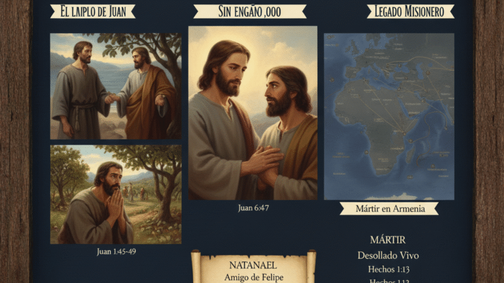 6. Bartolomé (Natanael): Se cree universalmente que Bartolomé es el mismo hombre llamado Natanael en el Evangelio de Juan, el amigo que Felipe trajo. Fue a él a quien Jesús dijo: "He aquí un verdadero israelita, en quien no hay engaño" (Juan 1:47).