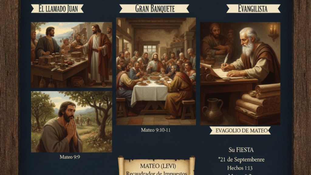 7. Mateo (Leví): El autor del Evangelio de Mateo. Era un recaudador de impuestos, un "pecador" público y traidor a los ojos de los judíos. Mateo, discípulo de Jesús, dejó su lucrativa mesa de impuestos con una sola palabra de Jesús: "Sígueme" (Mateo 9:9).
