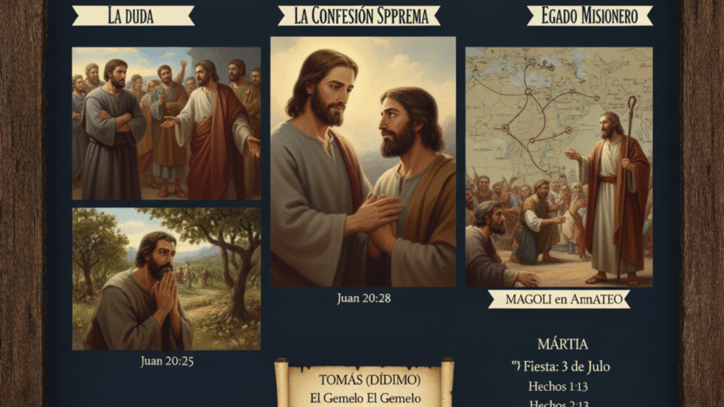 8. Tomás (Dídimo, "el Gemelo"): Famoso como el "discípulo incrédulo". Tomás, el discípulo de Jesús, no estaba presente cuando Jesús resucitó y se apareció a los demás, y famosamente declaró: "Si no viere en sus manos la señal de los clavos... no creeré" (Juan 20:25). Ocho días después, Jesús se le apareció e invitó a Tomás a tocar sus heridas. Tomás hizo la confesión de fe más elevada del Evangelio: "¡Señor mío, y Dios mío!".