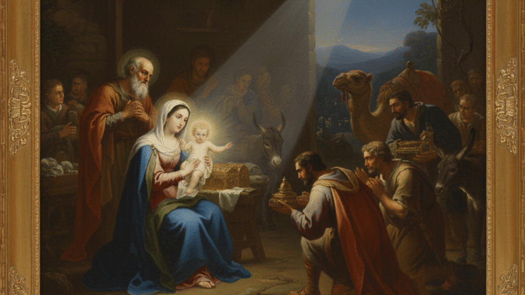 Al encontrar a Jesús en su pesebre, los magos lo adoraron y le ofrecieron regalos: oro (por su realeza), incienso (por su divinidad) y mirra (anunciando su futuro sufrimiento y muerte). Advertidos en sueños de no volver a Herodes, regresaron a su tierra por otro camino.