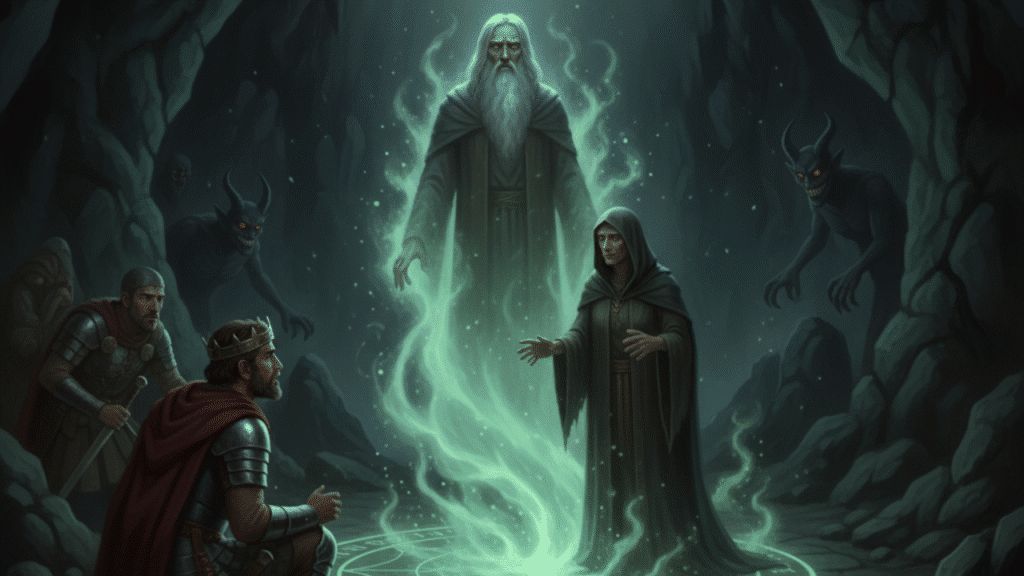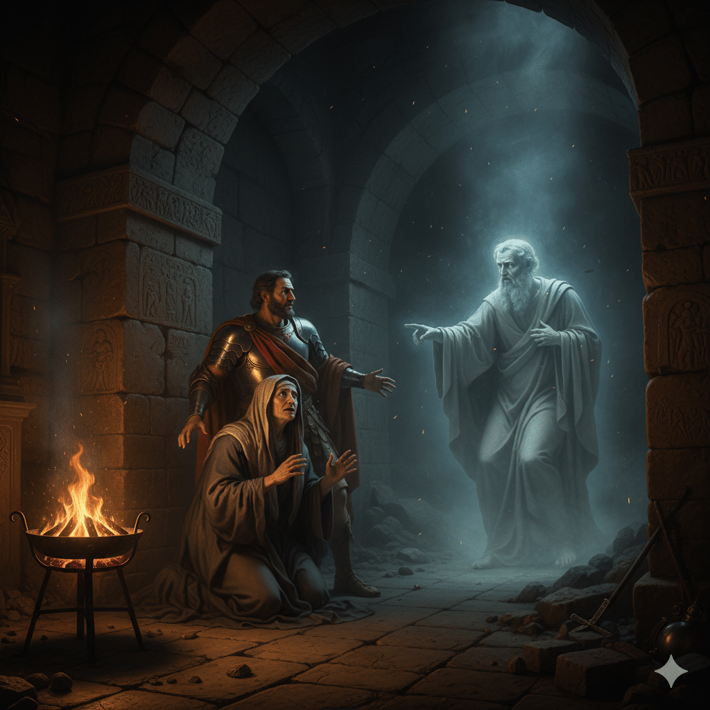 • La Historia: El Rey Saúl, desesperado, acude a una médium o bruja en Endor para intentar contactar al profeta Samuel (1 Samuel 28).