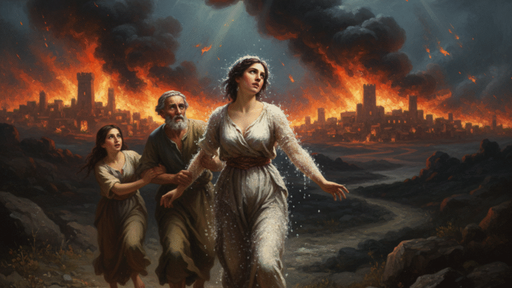 Los ángeles instan a Lot a huir con su familia. El momento en que Lot sale de Sodoma y Gomorra es de urgencia extrema, con los ángeles literalmente tomando sus manos para sacarlos de la ciudad. La orden es clara: "Escapa por tu vida; no mires tras ti".