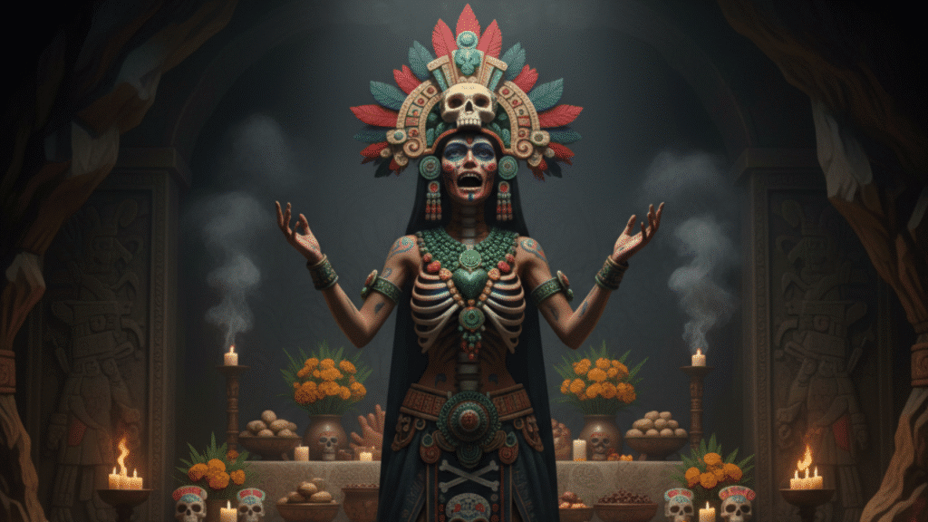 • Mictēcacihuātl (La Señora de los Muertos): En la mitología azteca, el inframundo (Mictlán) era gobernado por una pareja: Mictlantecuhtli (el señor) y Mictēcacihuātl (la señora). Esta "Señora de los Muertos" era una deidad poderosa, representada a menudo como un esqueleto, que presidía los festivales en honor a los difuntos.