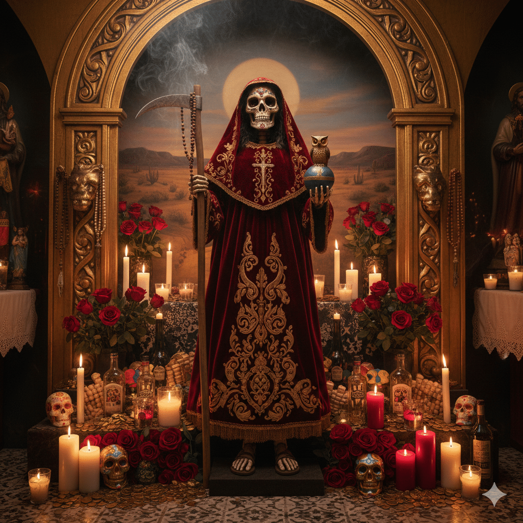 • La Imagen: Aunque es un esqueleto (que biológicamente podría ser de cualquier género), la figura casi siempre está vestida con túnicas y mantos que evocan la iconografía de la Virgen María. Se la ve como una figura maternal o una "santa" que intercede.