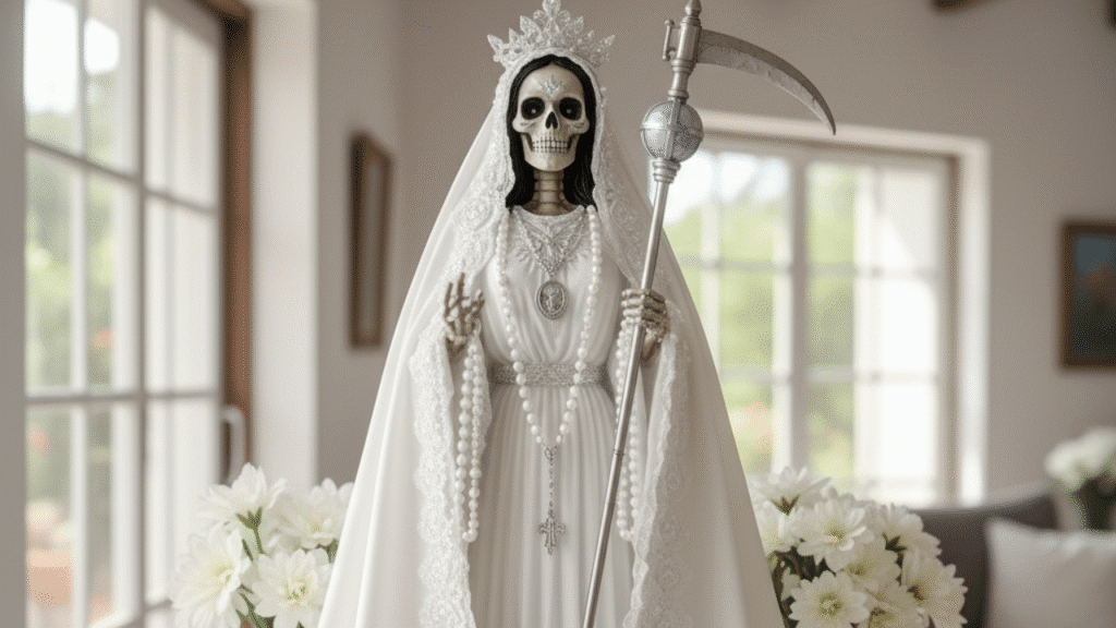 - La Santa Muerte Blanca: Se cree que la Santa Muerte Blanca (o Santísima Blanca) es la advocación de la pureza, usada exclusivamente para peticiones de sanación, limpieza espiritual y paz en el hogar. Los devotos usan esto como argumento para decir que el culto, en su esencia, es bueno.