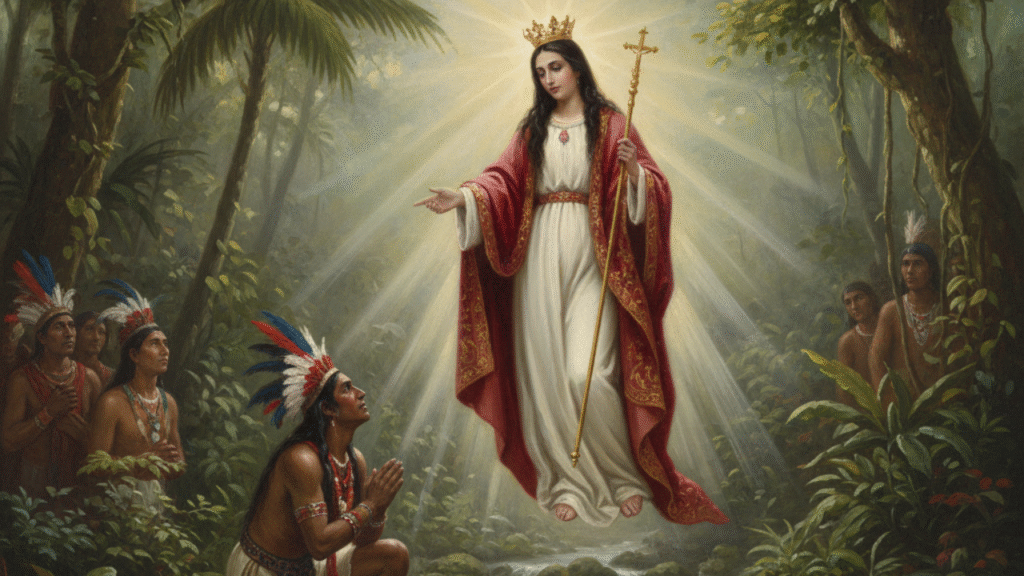 • La Primera Aparición (Agua): La Virgen María se le apareció por primera vez al cacique y su esposa en una quebrada (arroyo) de la selva, hablándoles en su lengua y pidiéndoles que fueran a ver a los blancos para que les enseñaran la fe y recibieran el bautismo. El cacique, asombrado, aceptó e incluso llevó a su tribu a establecerse en la nueva ciudad de Guanare.