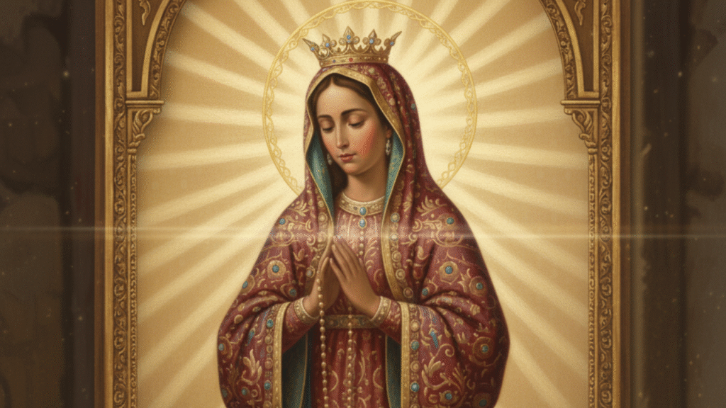 La imagen de la Virgen de la Chiquinquirá no es solo una foto de la Virgen Chinita; es una catequesis completa. Es la advocación de "Nuestra Señora del Rosario".