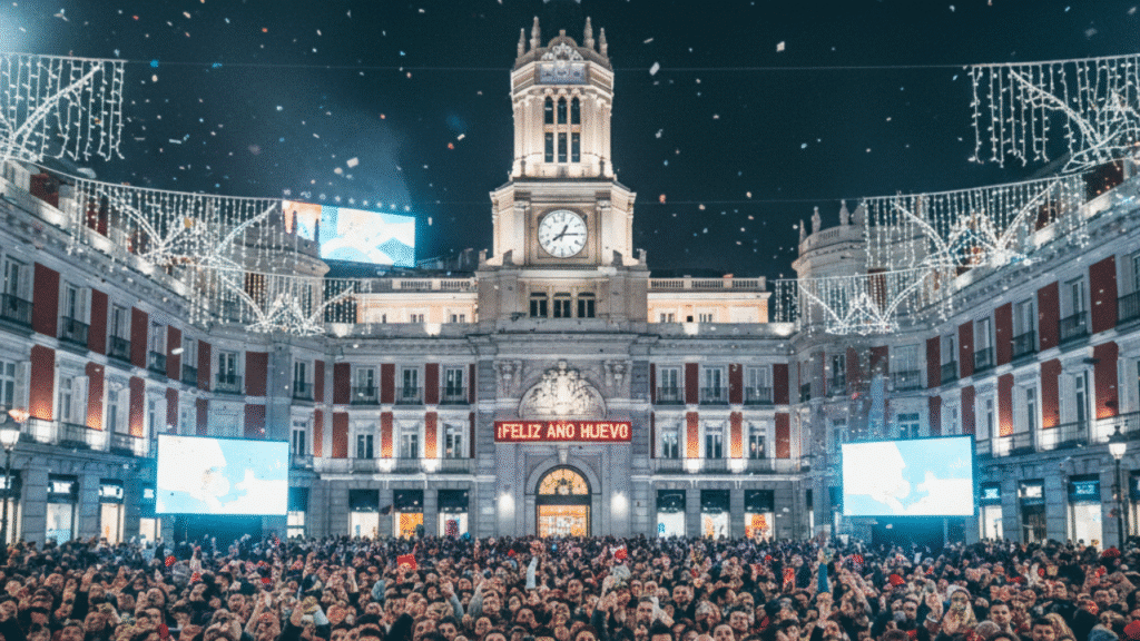 La costumbre de las 12 uvas se consolidó con la televisión. El ritual se centra en la Puerta del Sol de Madrid, donde el reloj da las famosas "campanadas".