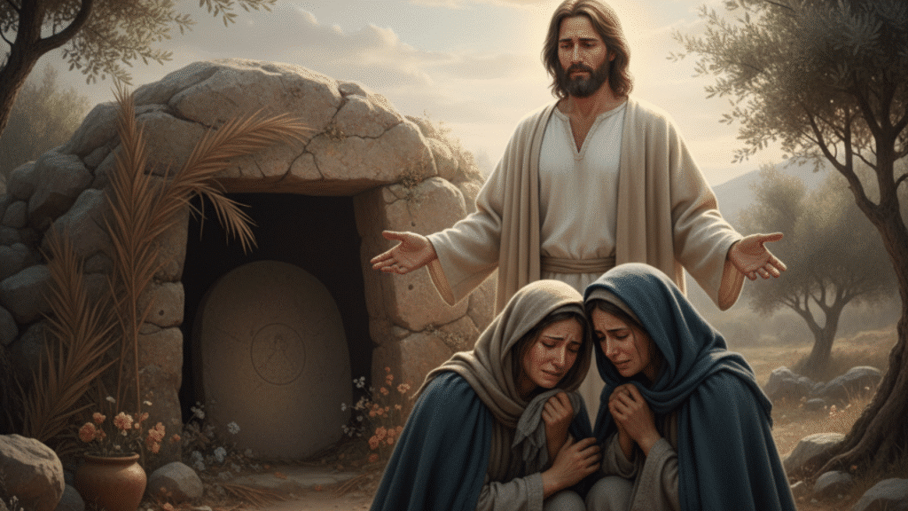 - La Muerte y el Duelo: Cuando Jesús llega a Betania, Lázaro ya lleva cuatro días muerto. El dolor de Marta y María es profundo.