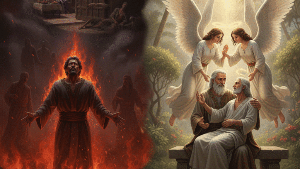 - Después de la Muerte: Ambos mueren. Lázaro es llevado por los ángeles al "Seno de Abraham" (un lugar de paz y consuelo). El hombre rico es sepultado y va al Hades (infierno), donde sufre tormentos.