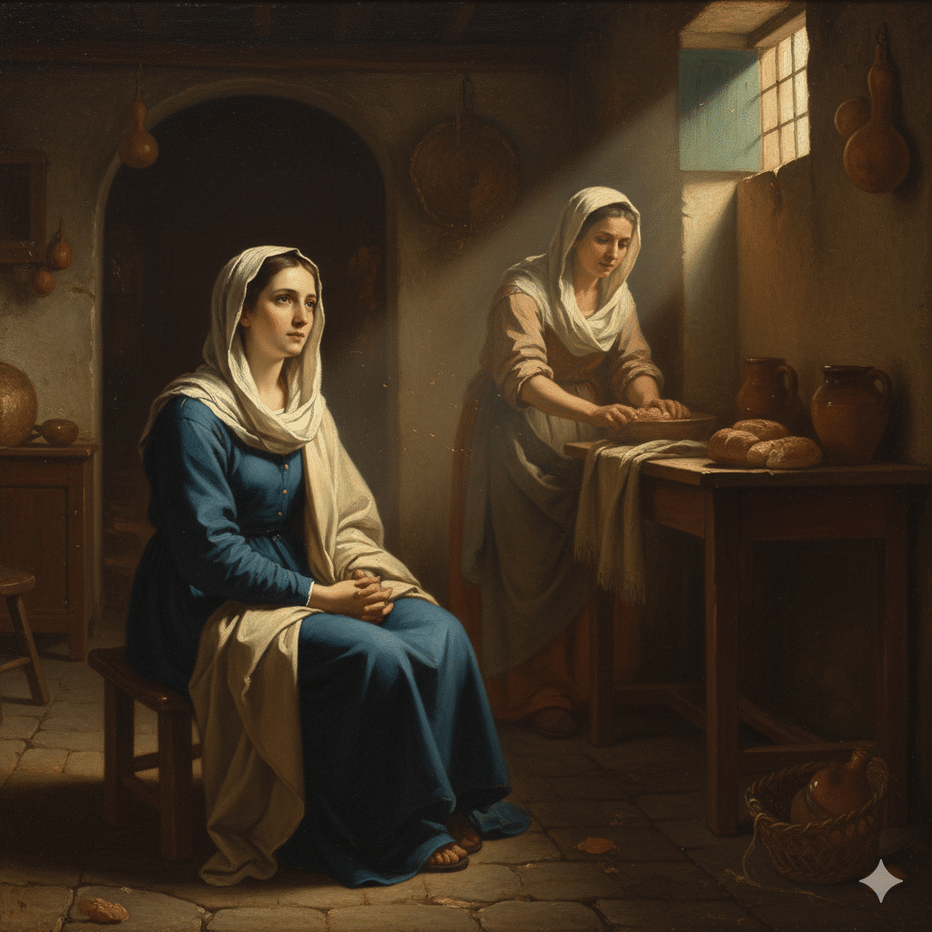 - La Elección de María: María está sentada a los pies de Jesús, escuchando Su Palabra. Para los judíos, sentarse a los pies de un maestro era el gesto de un discípulo.
