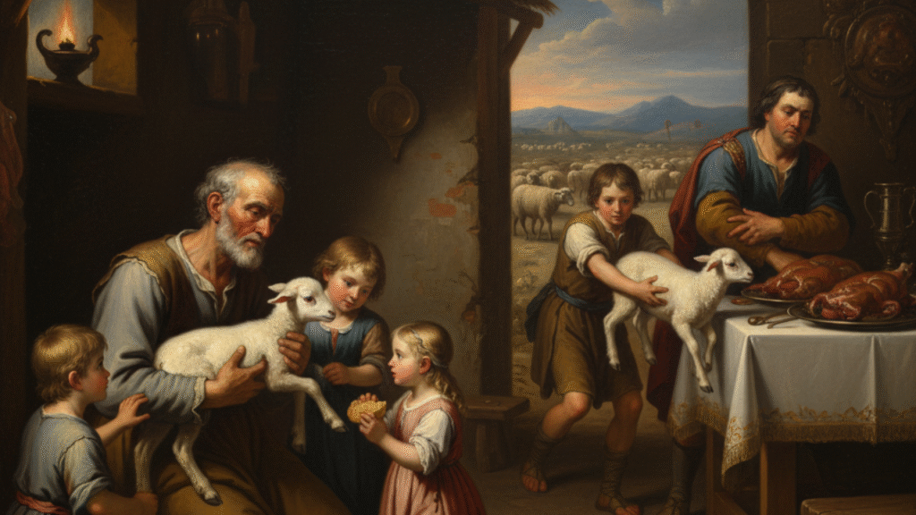 1 "Había dos hombres en una ciudad, el uno rico y el otro pobre. 2 El rico tenía numerosas ovejas y vacas; 3 pero el pobre no tenía más que una sola corderita, que él había comprado y criado, y que había crecido con él y con sus hijos juntamente, comiendo de su bocado y bebiendo de su vaso, y durmiendo en su seno; y la tenía como a una hija. 4. Y vino uno de camino al hombre rico, y él no quiso tomar de sus ovejas y de sus vacas, para guisar para el caminante que había venido a él, sino que tomó la cordera de aquel hombre pobre, y la preparó para aquel que había venido a él."
