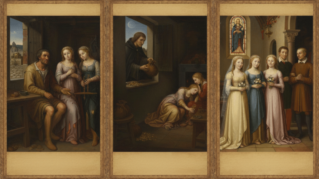 • La Historia: Había un hombre pobre en Myra que tenía tres hijas. Al no tener dinero para la dote, las muchachas corrían el riesgo de ser vendidas como esclavas o prostituidas.