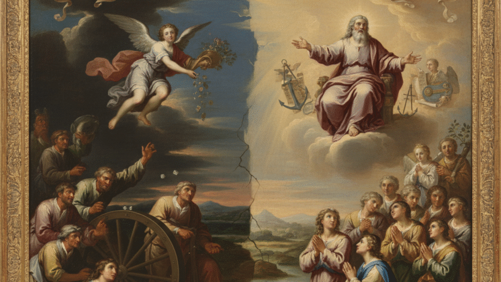El concepto de "suerte" es ajeno a la fe. El cristiano no cree en la suerte, sino en la Divina Providencia: la creencia de que un Dios amoroso cuida de nosotros y guía la historia. Por lo tanto, en lugar de rezar por "suerte", la oración correcta es un acto de confianza en la providencia de Dios.