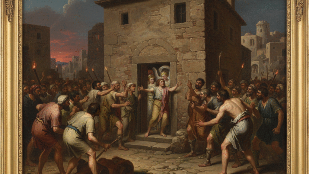 La historia alcanza su clímax en el capítulo 19, cuando dos ángeles, con apariencia de hombres, llegan a la ciudad de Sodoma. Lot, el sobrino de Abraham, los recibe en su casa, ofreciéndoles la sagrada hospitalidad oriental. Sin embargo, esa misma noche, la maldad de la ciudad se manifiesta de la forma más brutal: