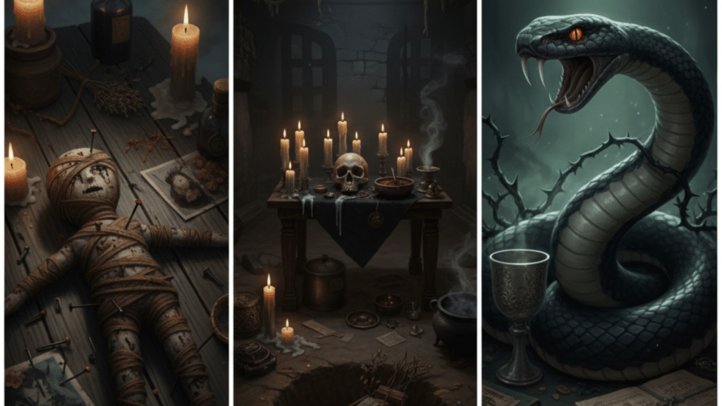 - Soñar con brujeria y serpientes: La serpiente (engaño) y la brujería (manipulación) juntas indican un ataque complejo de mentiras y veneno emocional en tu vida.