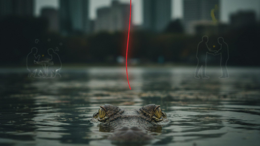 - Traición Oculta y Astucia: El cocodrilo (que se oculta bajo el agua y solo muestra los ojos) simboliza a una persona cercana (amigo, colega, socio) que es peligrosa, astuta y que está planeando traicionarte o dañarte.