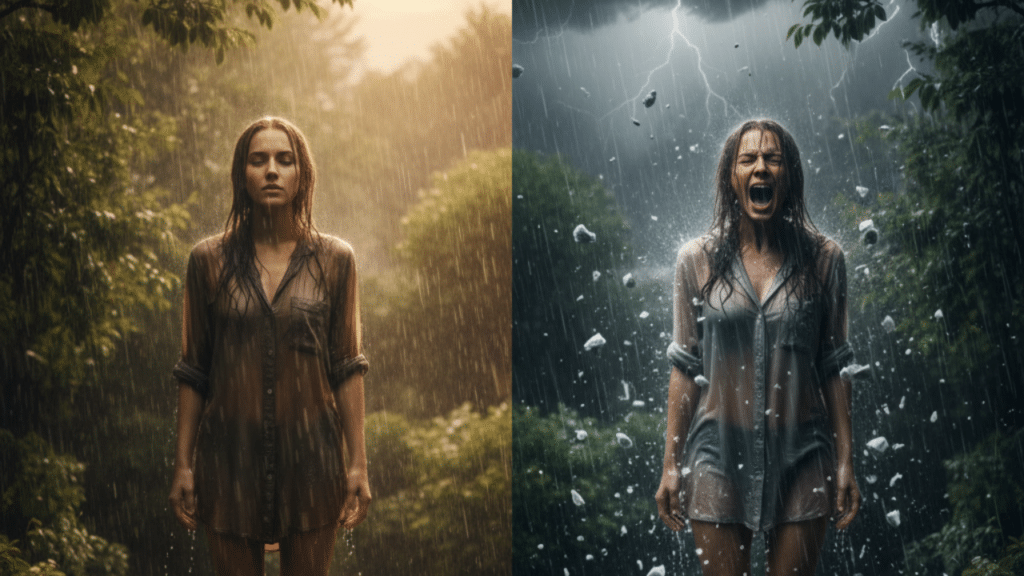 - Soñar con Lluvia Fuerte / Lluvia Torrencial: Indica una descarga emocional intensa. Puede ser un estrés reprimido, una tristeza abrumadora o una situación de la vida que te sientes incapaz de controlar. Aunque es violento, es una liberación necesaria.