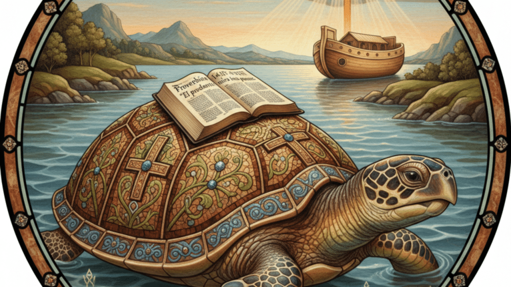 Aunque la tortuga no es una figura recurrente en el simbolismo cristiano clásico (que a menudo se centra en animales de la región del Levante), su significado se alinea con la virtud de la prudencia y la lentitud sabia enseñada en las Escrituras.