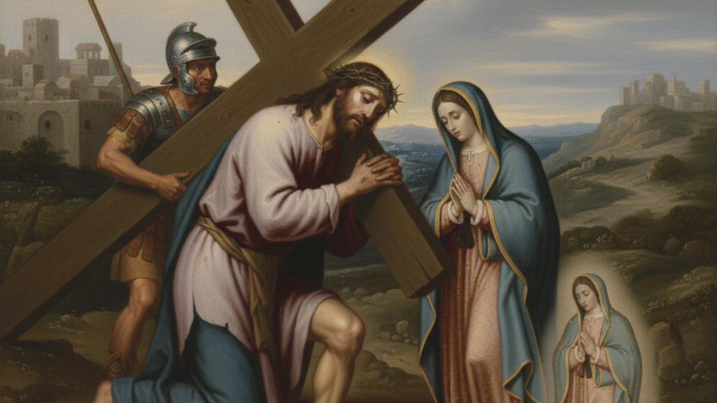Cristo carga el peso de nuestros pecados. María sale al encuentro de su Hijo en el camino al Calvario, tal como sale a nuestro encuentro en nuestras crisis.