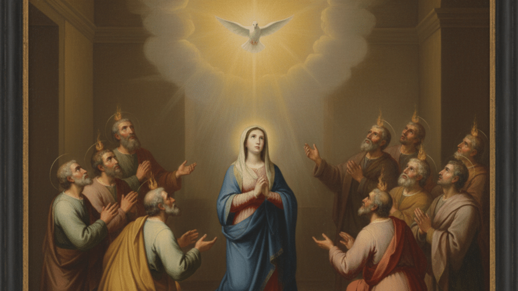 El Espíritu Santo desciende sobre María y los Apóstoles. Pedimos a la Estrella del Mar que nos ayude a ser dóciles a las inspiraciones del Espíritu Santo.