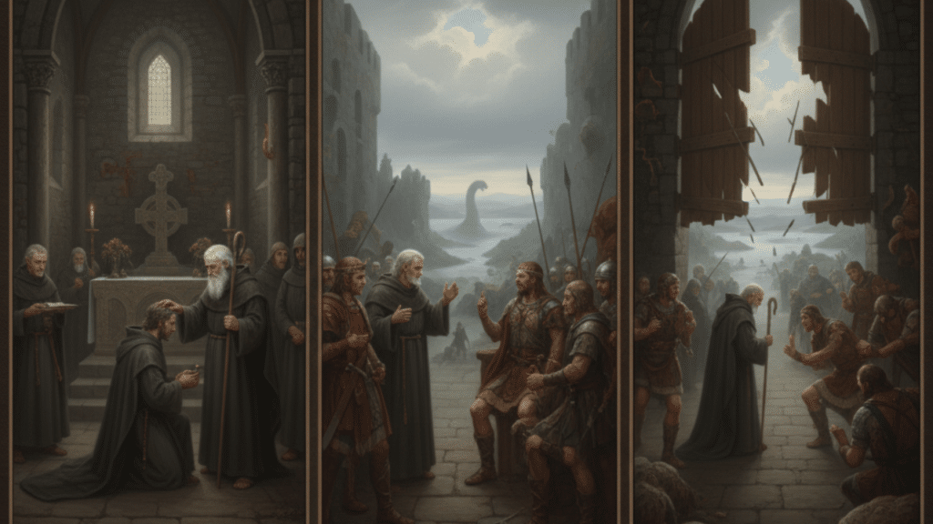 - Conversión de los Pictos: La tarea más difícil fue la conversión de los pictos, que habitaban el centro y el norte de Escocia y seguían siendo paganos. Columba viajó por toda la región, y un encuentro clave fue con el rey picto Bridei en Inverness. La tradición cuenta que Columba realizó milagros (incluyendo el famoso encuentro con el monstruo del Lago Ness, aunque esto es una adición posterior), logrando la conversión de Bridei y su corte.
