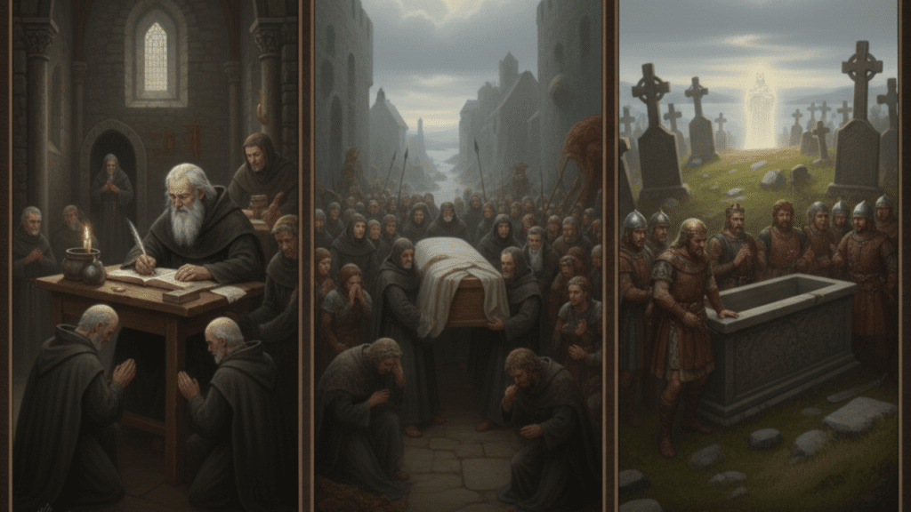- Muerte Tranquila (597): Columba murió pacíficamente en la noche entre el 8 y el 9 de junio de 597, mientras copiaba un salterio en el scriptorium de Iona. Murió justo antes de que San Agustín de Canterbury comenzara su misión en Inglaterra, simbolizando el florecimiento simultáneo de las tradiciones celtas y romanas.