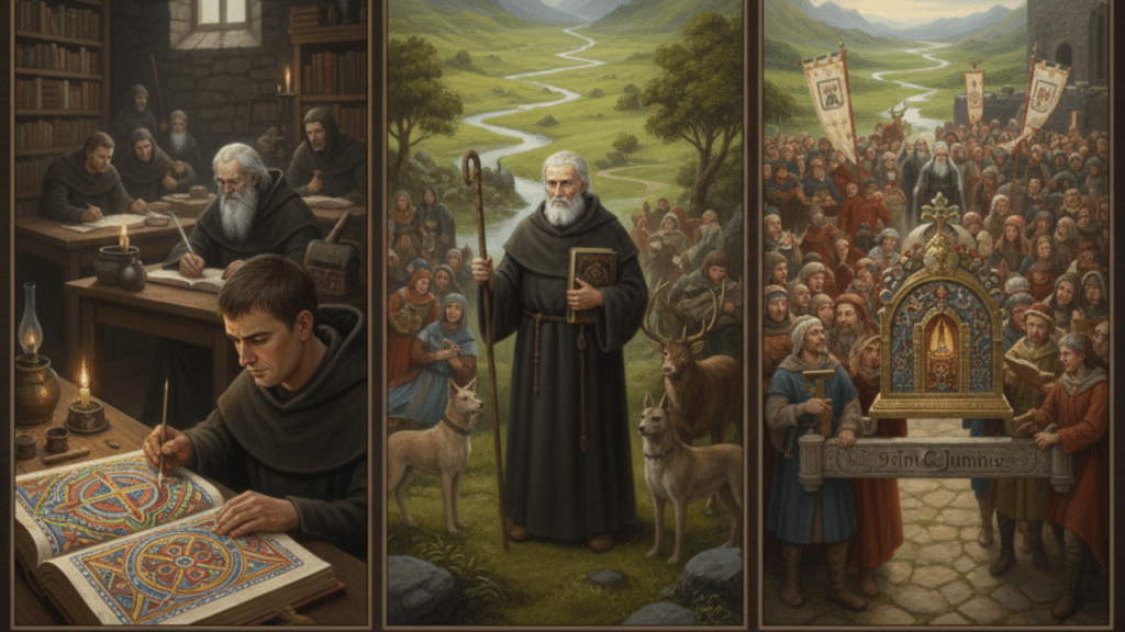 - Vida Ascética: A pesar de su nobleza, Columba vivió con la misma austeridad que sus monjes, dedicándose a la oración, la copia de libros y el trabajo manual.