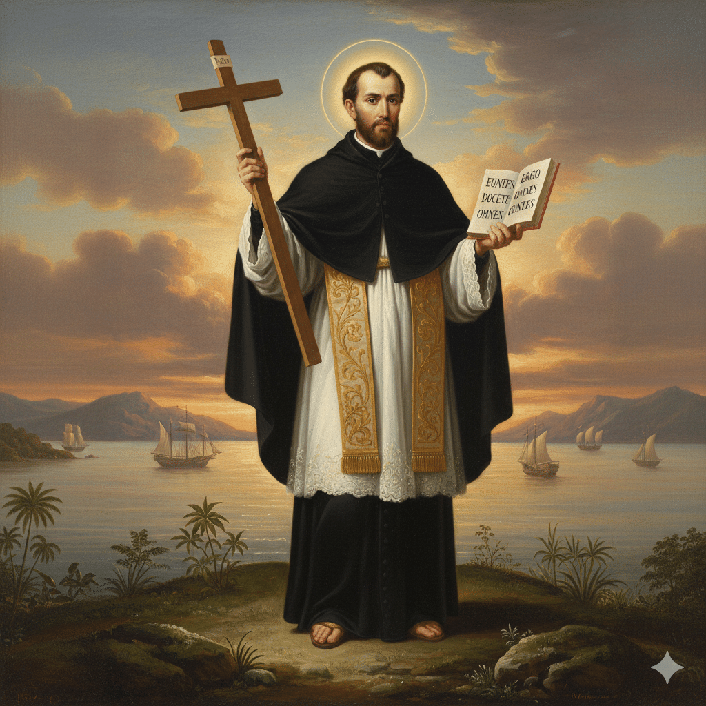 San Francisco Javier (Francisco de Jasso y Azpilicueta, 1506–1552), fue uno de los diez compañeros fundadores de la Compañía de Jesús y el misionero católico más grande de la historia después de San Pablo. Conocido como el Apóstol de las Indias y Patrono Universal de las Misiones, su vida fue una incansable carrera de fe que abarcó vastas regiones de Asia, desde la India hasta Japón, con la ambición de alcanzar China.