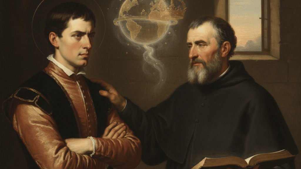 La pregunta que le repetía su compañero de cuarto, San Ignacio de Loyola, fue: **"¿De qué le sirve al hombre ganar el mundo entero si pierde su alma?"** (Marcos 8:36). Esta reflexión lo llevó a renunciar a su ambición académica y a abrazar la vida religiosa.