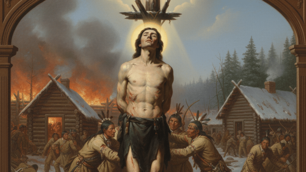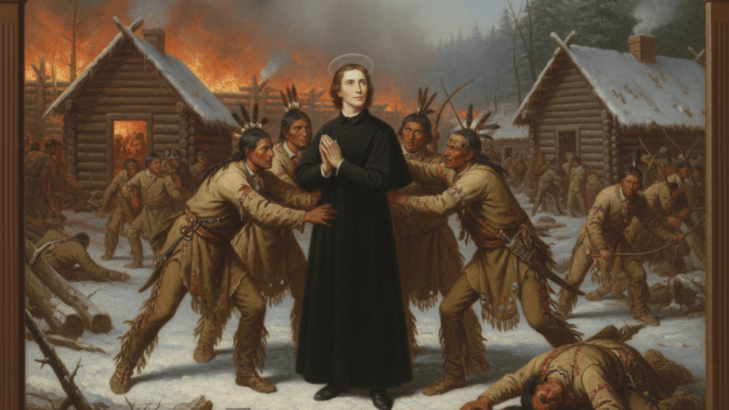 En marzo de 1649, la aldea de Saint-Louis, donde se encontraba Gabriel Lalemant, fue atacada por guerreros iroqueses. Aunque tuvo la oportunidad de huir con algunos conversos, Gabriel decidió quedarse para asistir espiritualmente a los heridos y bautizar a los moribundos. Su captura marcó el inicio de un calvario de casi quince horas de tortura ininterrumpida. La resistencia silenciosa de San Gabriel Lalemant fue un acto de caridad suprema, ofreciendo cada dolor por la salvación de sus propios captores.