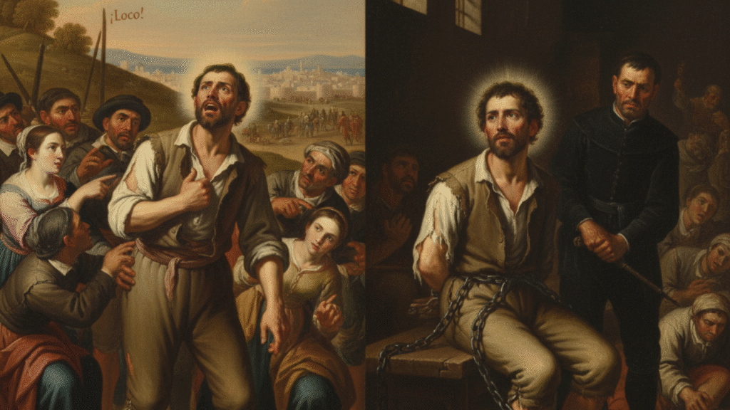Tuvo una crisis nerviosa y espiritual tan profunda que corrió por las calles de Granada, golpeándose el pecho, confesando sus pecados a gritos y rasgando sus ropas. La gente, convencida de que estaba loco, lo apresó. Fue encerrado en el Asilo Real, donde fue atado y tratado con los brutales métodos de la época para curar la locura (azotes, agua fría).