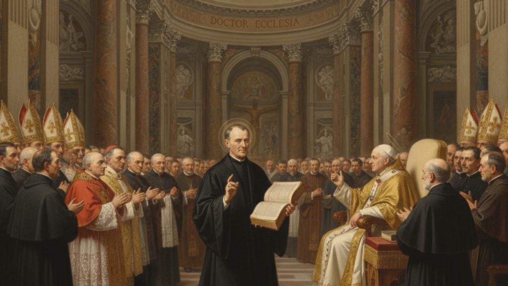 - Doctor de la Iglesia: Fue beatificado en 1864 y canonizado y declarado Doctor de la Iglesia por el Papa Pío XI en 1925, en el mismo acto. Su título reconoce la universalidad de sus enseñanzas y su obra como catequeta fundamental.