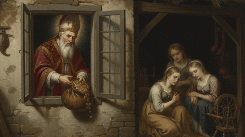 La leyenda más famosa que dio origen al mito de los regalos es la de las tres hermanas pobres. Su padre era tan pobre que no podía pagar sus dotes, por lo que estaban destinadas a ser vendidas como esclavas o a la prostitución. Al enterarse de su situación, San Nicolás, durante tres noches consecutivas, arrojó en secreto una bolsa llena de monedas de oro a través de la ventana de su casa. Con este regalo anónimo, las tres jóvenes pudieron casarse honorablemente.