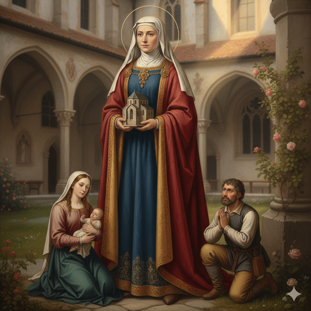 • Iconografía: Se la representa habitualmente como una noble condesa sosteniendo una maqueta de una iglesia o repartiendo limosna. Su imagen es un recordatorio de que la Fe, Esperanza y Caridad pueden florecer incluso en las circunstancias más dolorosas, convirtiendo un corazón herido en un jardín de bendiciones para el mundo.