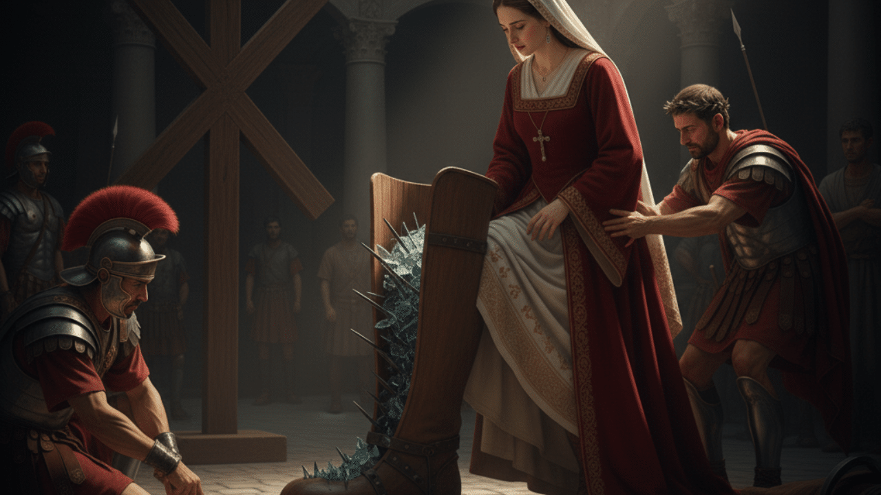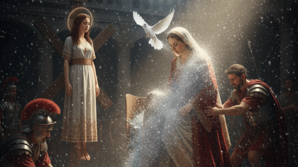 - Los Trece Martirios: La tradición narra que, debido a su negativa a sacrificar a los ídolos, fue sometida a trece tormentos, uno por cada año de su vida. Desde ser encerrada en una bota llena de cristales y clavos hasta ser puesta en una cruz en forma de aspa (la cruz de San Andrés), cada castigo reafirmó su voluntad.