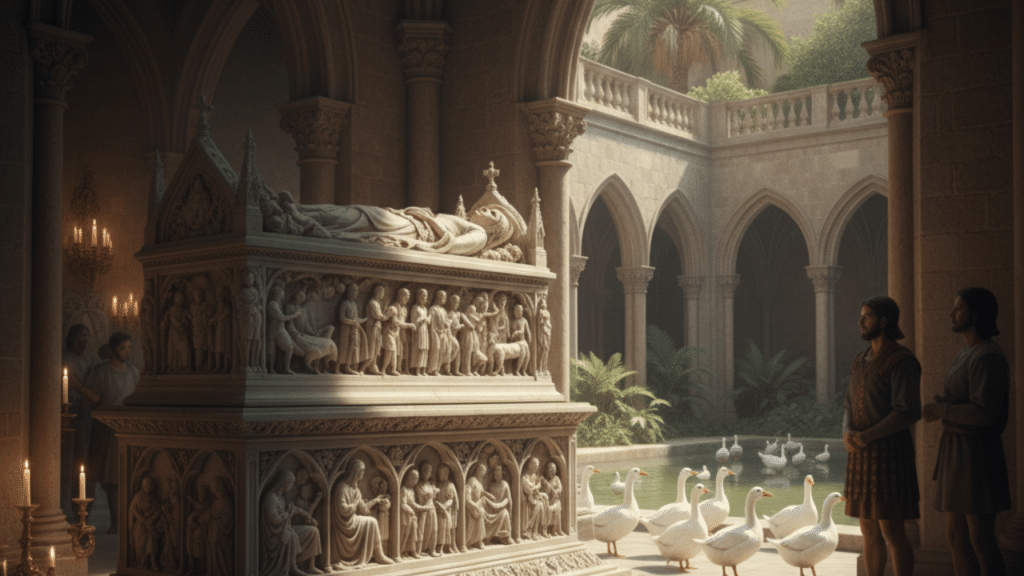 Uno de los puntos más sagrados del templo es la cripta donde reposan los restos de la joven. El sarcófago de alabastro, una obra maestra de la escultura, narra visualmente la vida de Santa Eulalia de Barcelona. Además, en el claustro de la catedral de Santa Eulalia, habitan trece ocas blancas. Estas aves no son meros residentes, sino un símbolo viviente de los trece años y los trece martirios de la santa, manteniendo viva la conexión entre el pasado romano y la Barcelona actual.