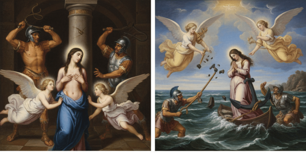 • Las Anclas: Intentaron ahogarla con un ancla atada al cuello, pero el instrumento de muerte fue cortado por seres celestiales.