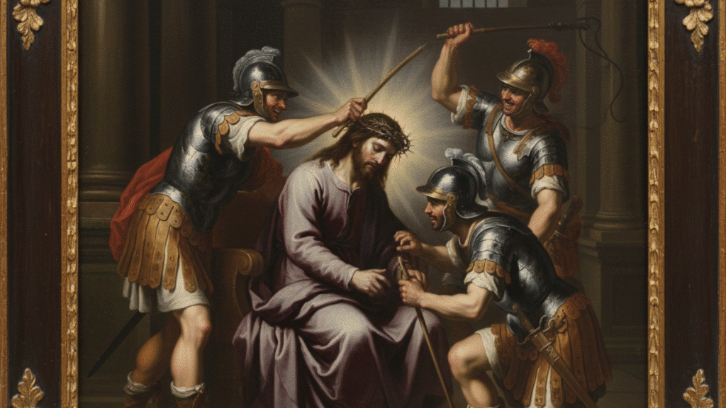 - Meditación: Contemplamos a los soldados que, para burlarse de Jesús como rey, tejen una corona de espinas afiladas y la clavan en su cabeza. Lo visten con un manto púrpura y lo golpean, adorándolo con sarcasmo. Meditamos en la humildad de nuestro Rey.