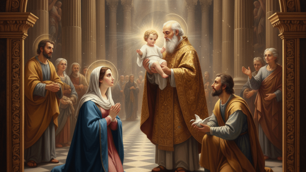 - Meditación: Contemplamos a María y José presentando a Jesús en el Templo, cumpliendo con la Ley. Allí, el anciano Simeón lo reconoce como el Salvador y profetiza la espada de dolor que atravesaría el corazón de María, uniendo la alegría a la sombra de la Cruz.