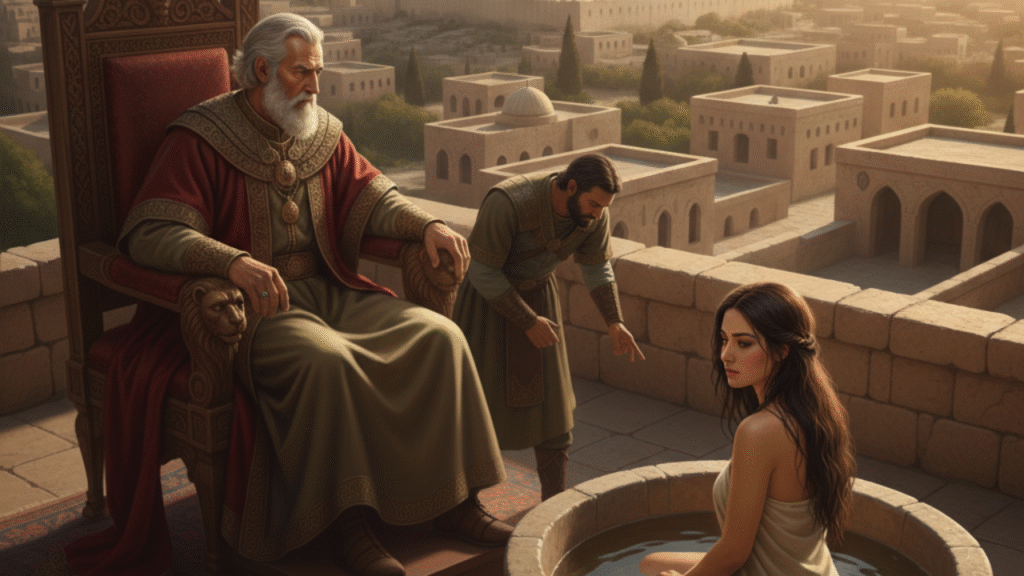 1. El Pecado del Rey: En la primavera, "en el tiempo que salen los reyes a la guerra", David se quedó en Jerusalén en lugar de ir a la batalla con su ejército. En un momento de ocio, vio a Betsabé, la esposa de Urías, bañándose. La deseó, mandó a buscarla y cometió adulterio con ella.