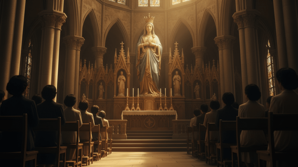 - La Catedral de Urakami: Construida por los fieles tras el fin de la persecución en Japón, esta catedral era el símbolo de la libertad religiosa recuperada. En su altar principal se encontraba una hermosa estatua de la Virgen, tallada en madera y traída de Italia o España, que presidía las oraciones de la comunidad.