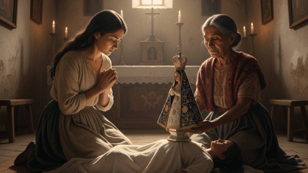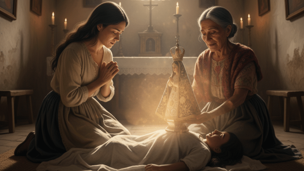 • La Intercesión: La madre de la niña, desesperada, acudió a una viejita indígena que custodiaba la imagen de la Virgen. La anciana le aconsejó que tomara la pequeña imagen y la pusiera sobre el cuerpo de su hija muerta, rezando con fe.